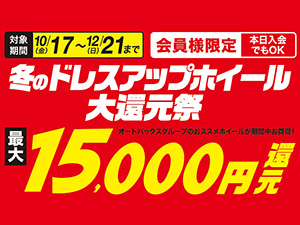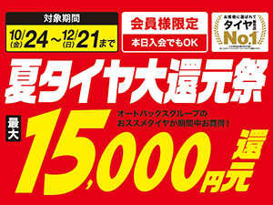 キャンペーン一覧 ホーム キャンペーン一覧 当店で実施予定のキャンペーン PayPayポイントが最大5%戻ってくる! – PayPayアプリでクーポンを獲得してオートバックスでお得にお買い物 11月1日(土)から12月31日(水)まで実施 オートバックスで実施!PayPayアプリで事前にクーポンを獲 スタッドレスタイヤ大還元祭 – 最大1万円還元!2025年冬もオートバックスはタイヤが安い 11月21日(金)から11月30日(日)まで実施 凍結路面・雪上路面で安定走行!冬/年末年始を安心&安全にド カーナビ大還元祭 – 2025年冬 オートバックスなら購入金額に応じて最大7万円還元! 11月14日(金)から12月15日(月)まで実施 購入金額に応じて最大7万円還元!2025年秋冬のドライブが 冬のドレスアップホイール大還元祭 – 2025年冬 オートバックスはホイールが安い!サイズに応じて最大15,000円還元 10月17日(金)から12月21日(日)まで実施 購入サイズに応じて最大15,000円還元!2025年秋冬の 夏タイヤ大還元祭 – 2025年冬 オートバックスはタイヤが安い!サイズに応じて最大15,000円還元 10月24日(金)から12月21日(日)まで実施 購入サイズに応じて最大15,000円還元!2025年秋冬の ドライブレコーダー・電子ミラー大還元祭 – 2025年冬 オートバックスなら対象機種購入で最大10,000円還元! 10月17日(金)から1月12日(月・祝)まで実施 対象機種購入で最大1万円還元!2025年冬のドライブがも 2025年-2026年 オートバックスヒートアップキャンペーン – Tune&Dress up スポーツパーツが安い! 2026年3月31日(火)まで実施中 2026年3月31日(火)までメーカー希望小売価格から最大45%OFF