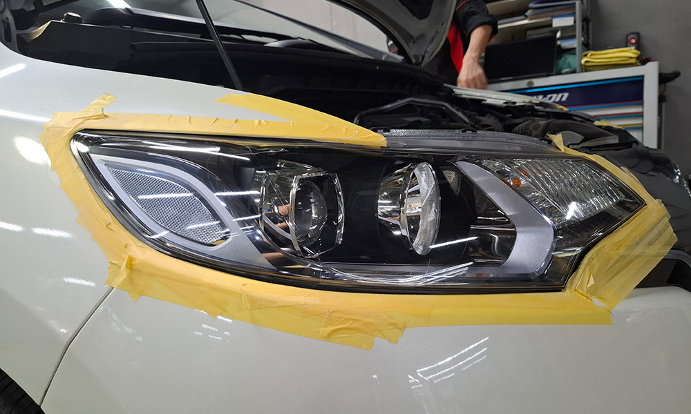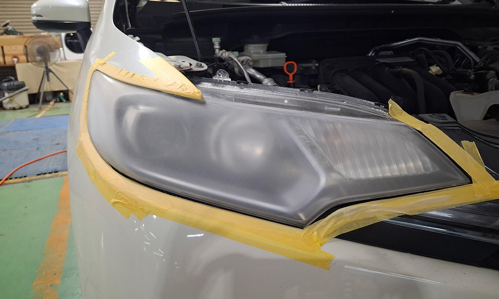 ヘッドライトカバーをマスキングして周囲を保護した後、表面をポリッシャーで磨きます。ポリッシャーで磨いた後、車の状態に合わせて400番~2000番までのサンドペーパーを使い分けてさらに研磨します。