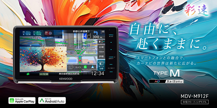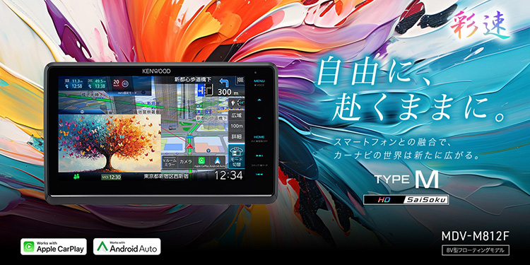 今回発売されるTYPE MシリーズはTYPE MX 1モデル・TYPE M 6モデルの全7モデル。すべての機種で彩速ナビのディスプレイ上でスマートフォンの機能を使用できるApple CarPlay/Android Autoに対応。ワイヤレスまたはUSBケーブルで接続してスマートフォンのさまざまな機能と連携し、iPhoneのSiriやGoogleアシスタントによる音声操作も可能です。また画面サイズは大画面10V型/大画面9V型の他に8V型・7V型もラインアップします。