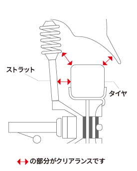 チェーンを装着していない状態で、タイヤ・ホイールとサスペンション・タイヤハウス・フェンダーなどのすき間[クリアランス]が十分あることを確認してください[目安は約3cm以上]。すき間が十分に確保できない場合、走行中にタイヤ・ホイールとサスペンション・タイヤハウス・フェンダーなどに接触し、チェーンの早期切損・車の損傷および重大な事故を起こす恐れがあります。また純正オプションや純正以外のタイヤ・ホイールに変更している場合や改造車などはクリアランス不足により装着できない場合があります。